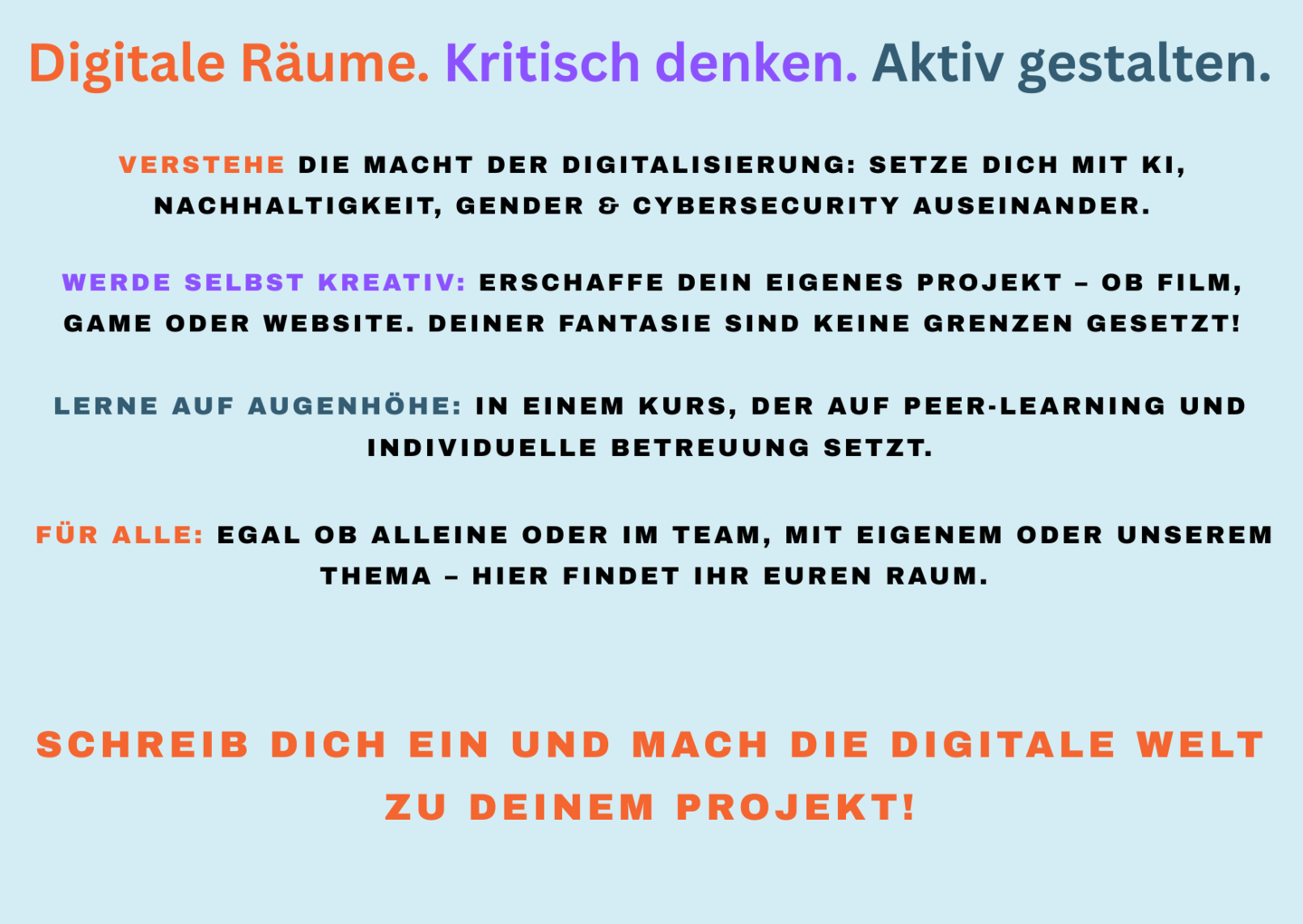 Um dieser Entwicklung etwas entgegenzusetzen, will sich der Kurs Projekt Digital mit aktuellen politischen wie gesellschaftlichen Herausforderungen digitaler Räume auseinandersetzen sowie den (kritischen) Umgang und Einsatz digitaler Medien ermöglichen. Beispielthemen hierfür sind K.I., Nachhaltigkeit, Barrierearmut, Gender, Cybersecurity und viele mehr.